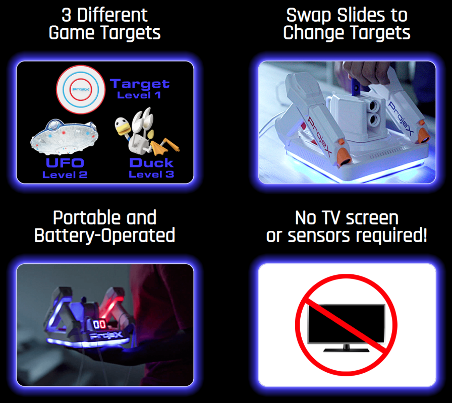 ProjeX™ has 5 different built-in games to test your speed and skills. With 3 skill levels – beginner, advanced, and expert – anyone can play and compete. The “beginner” setting was actually simple enough to accommodate even my 7 yr old.