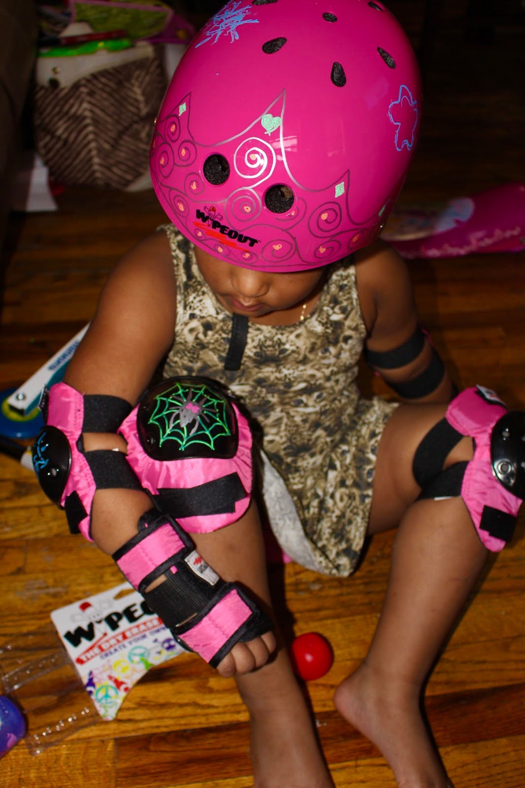 Gabriella and I were surely having loads of fun designing, wiping off, and re-designing her new safety gear. She just HAD to wear it right away and even discovered how well they protected her knees when she tripped and slid on her knee pads. She thought she’d invented a new game…. I assured her it was NOT.