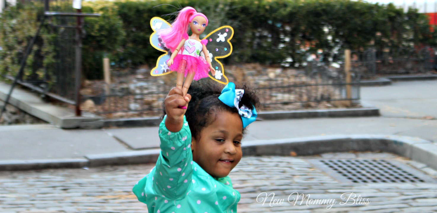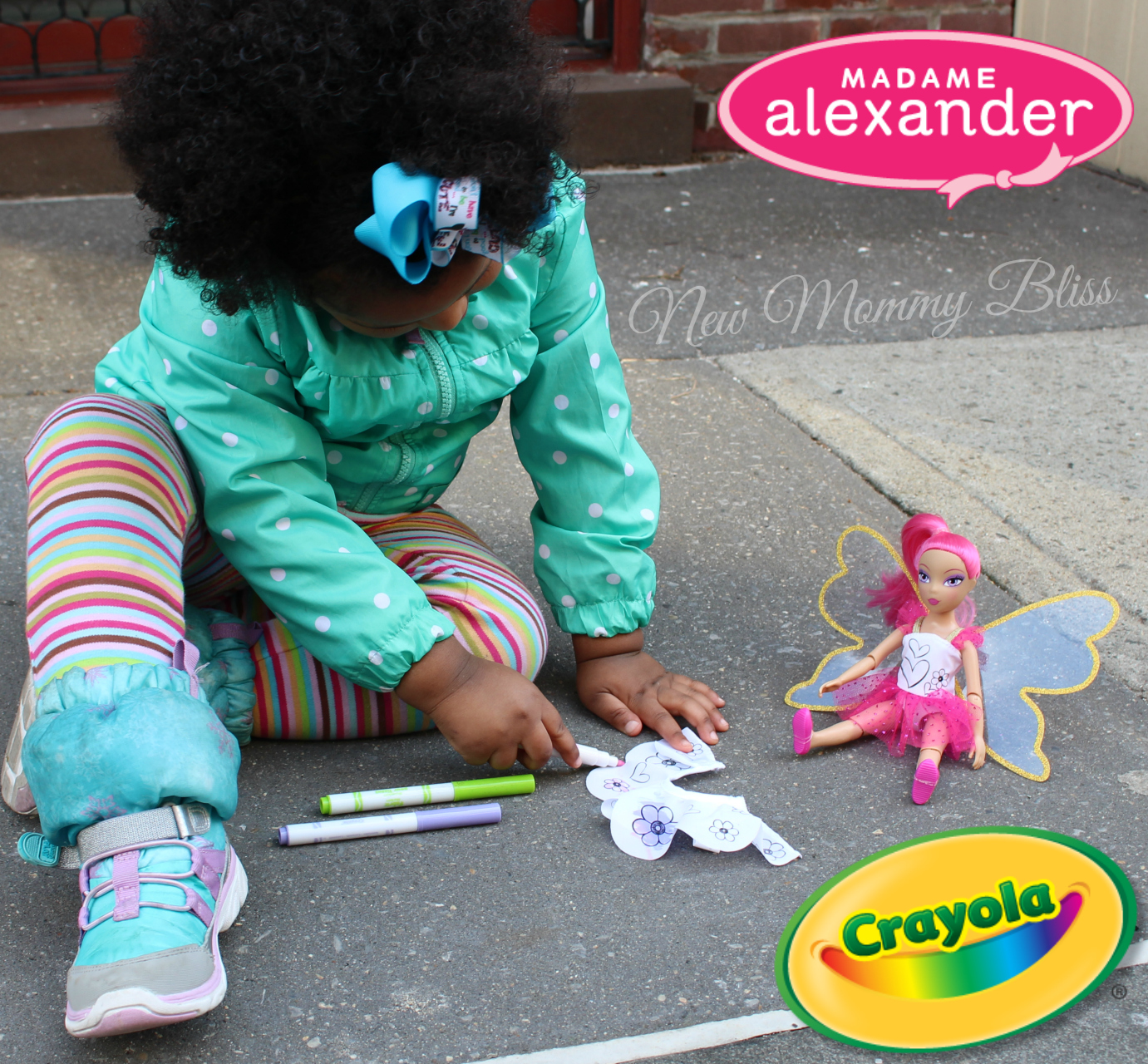 Pixie Doodles™ are absolutely adorable Fairies which your 3+ year olds would have a blast “styling”. The dolls come with 3 Crayola™ fabric markers, Wings, Stickers, gems, and the doll’s 2-in-1 outfit (dress with removable skirt). Madame Alexander sent us Jazzberry Pink, Purple Pizzazz, Razzle Dazzle Rose Outfit, & Silver Starlight Outfit. I handed my daughter Jazzberry and gave her friend Pizzazz… They were very excited!
