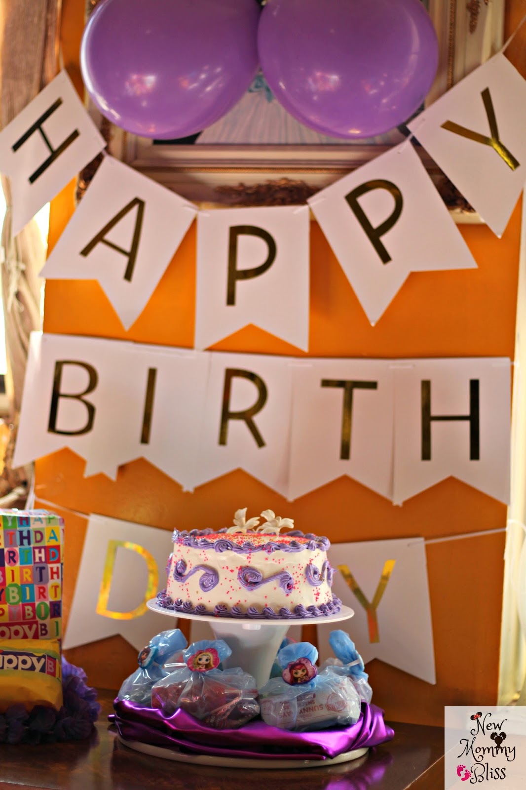 I placed beautiful white Cake Stand upside down and put the small cake on top. Had to make sure it was centered or else Gabby’s moving around would’ve dropped it. Added some purple shiny fabric to the bottom (or top?) of the upside down cake stand and had gabby help place the goody bags on it. Made the set-up look a bit cleaner.